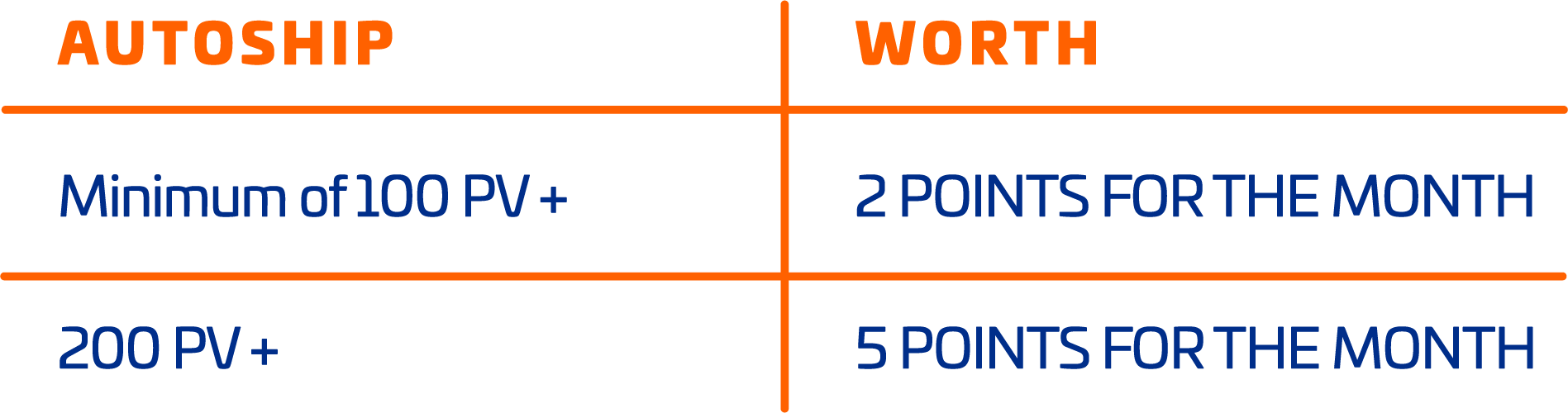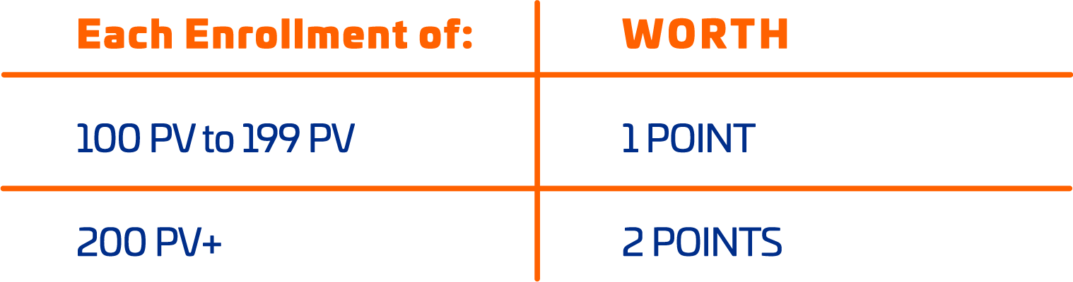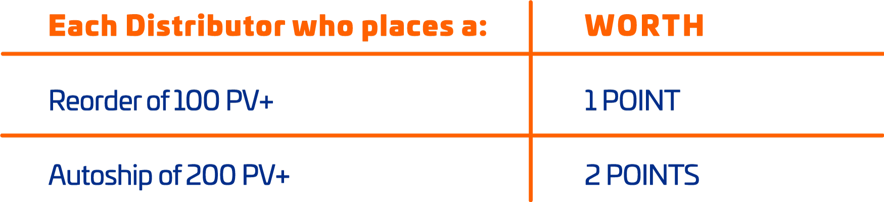 Points are earned for Distributors you have personally enrolled who rank advance to a new highest rank and for the highest rank they obtain during the qualification period. Personal Business Centers rank advancements qualify in this category.